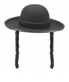 Chapeau noir en feutrine rigide, avec deux tresses (à peu près 35 cm) noires accrochées au chapeau.... chapeau de rabin
